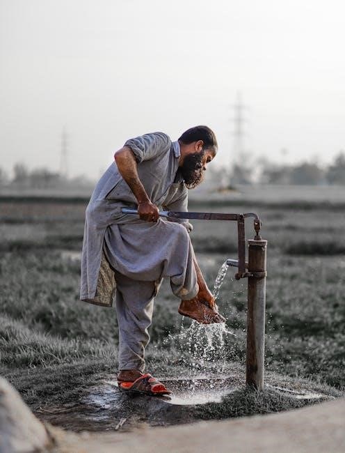 Proper usage of a manual water pump ensures efficiency, safety, and longevity. Avoid overexertion, as excessive force can damage the pump or lead to injury. Always follow the manufacturer’s instructions for operation, including recommended pumping speeds and stroke lengths. Regularly inspect the pump and hoses for signs of wear or damage. Ensure the pump is correctly installed and level to maintain optimal performance. Use the appropriate hose size to avoid restricting water flow. Keep the pump clean and free from debris to prevent clogging. Train all users on proper techniques to ensure safe and effective operation. By adhering to these guidelines, you can maximize the pump’s effectiveness, reduce maintenance needs, and extend its service life. Proper usage also helps prevent accidents and ensures reliable performance in critical situations.